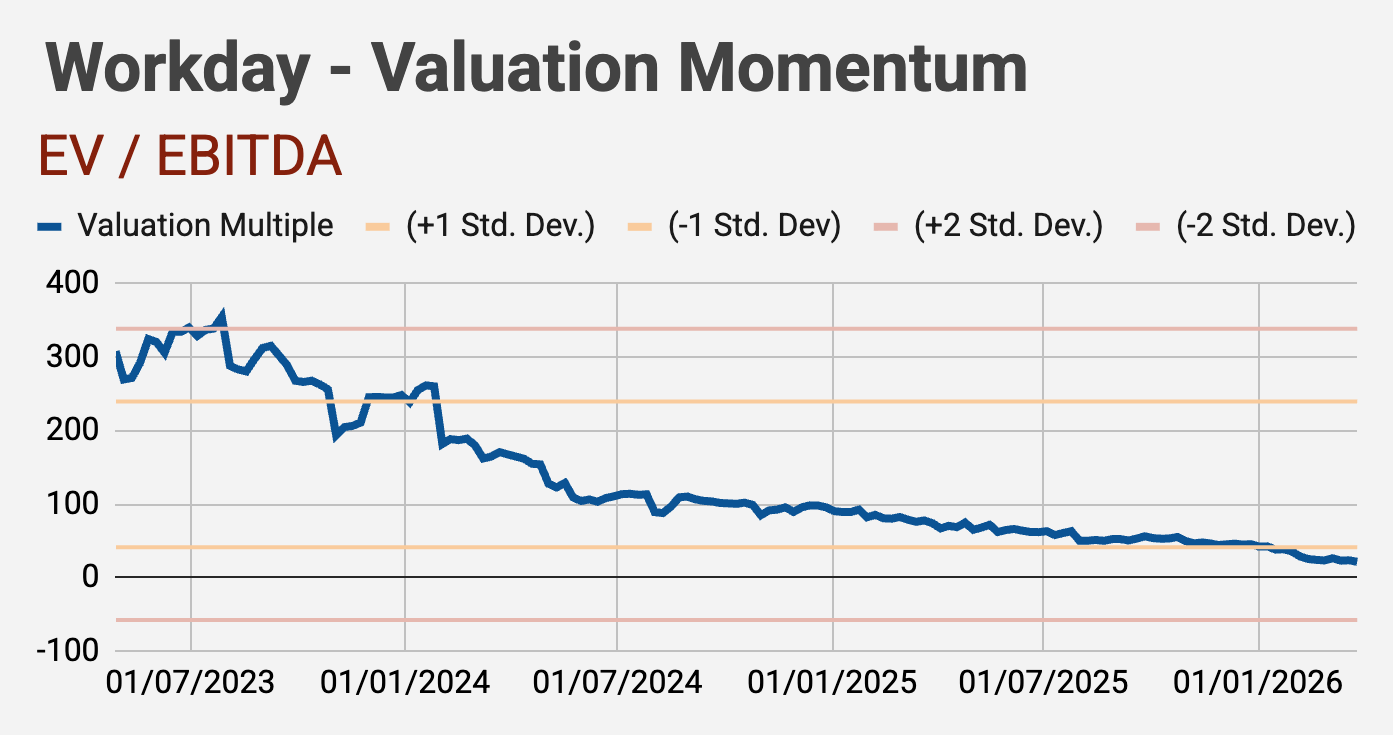 - The Data: Workday's EV/EBITDA multiple fell from 42.5x in early January to 21.4x by late March, breaking well below the negative one standard deviation band of its historical range.
