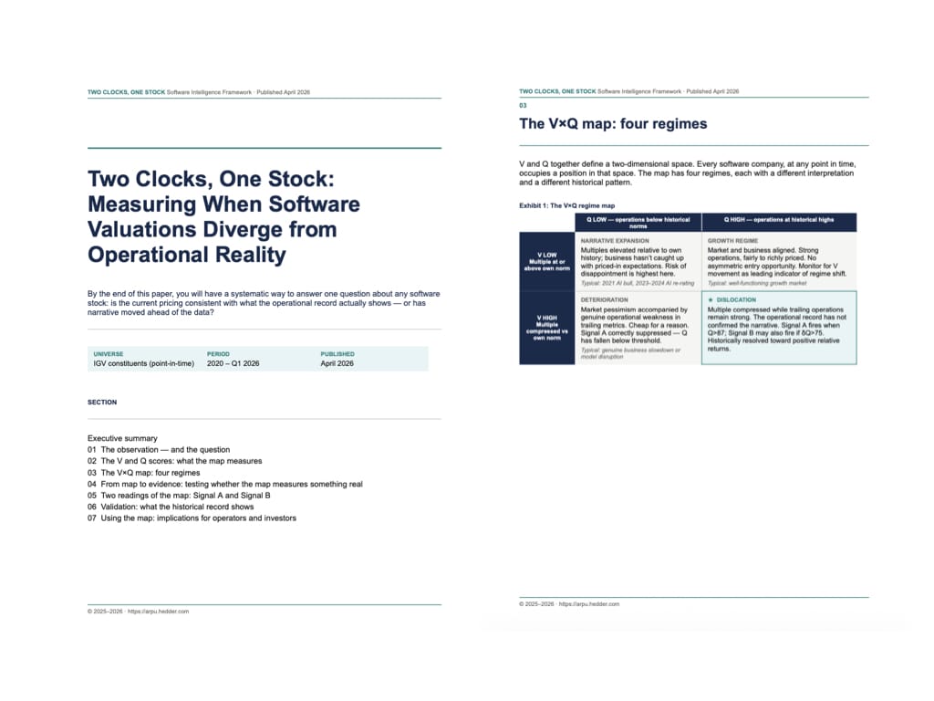 - What comes next — the weekly scan: The whitepaper introduces the framework and validates it against the historical record. Beginning in 2026, we will publish the full scored table — V and Q readings for every IGV constituent, updated weekly — in the research letter. This paper is the methodology behind that scan: what the scores mean, how they are constructed, and what the historical record shows when they reach specific combinations.